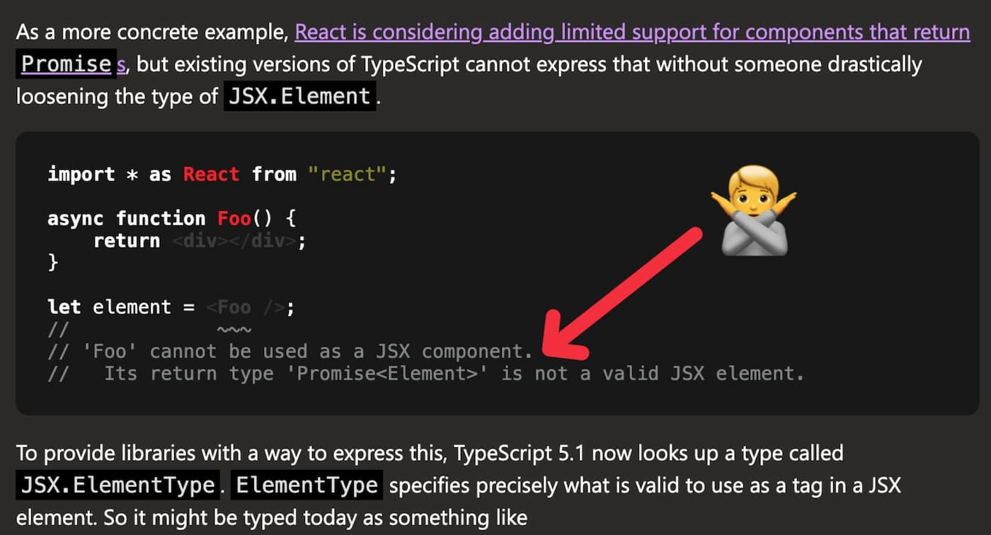 An important TypeScript release that will allow React to be able to declare its own valid JSX types. It is planned to use this new feature as soon as possible in React typedefs, which have already been forked to continue to support older versions (TypeScript <= 5.0).