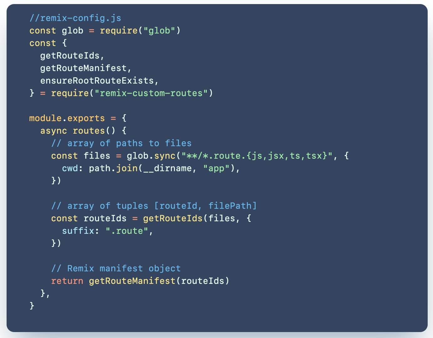 Explains how Remix v2's flat file routing will improve featured-based code colocation. This can be activated from Remix v1 with a feature flag. With Remix, you can create your own routing conventions: Jacob proposes to improve colocation even further with remix-custom-routes and a naming convention using the .route.tsx suffix.