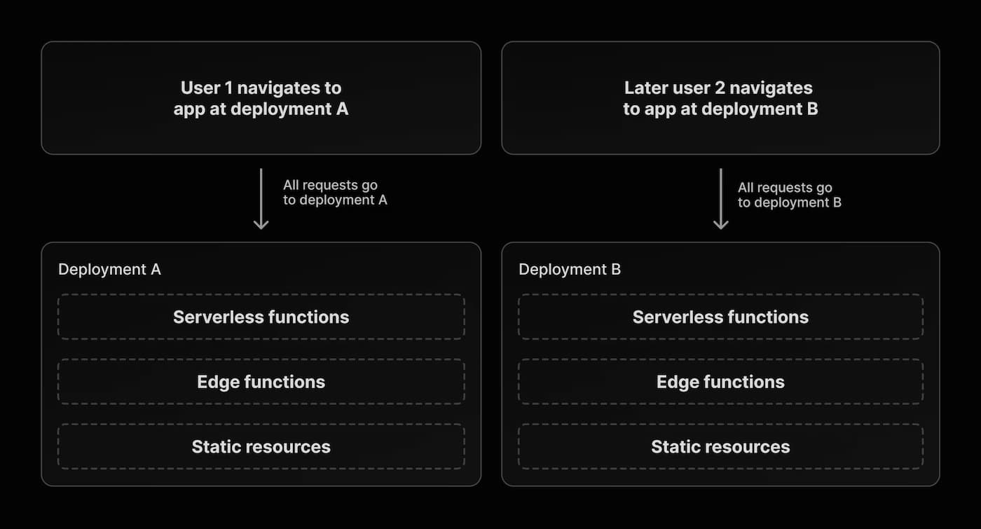 New Vercel feature that mitigates the back/front desynchronisation that can occur during a new deployment: requests from state clients can now be routed to the appropriate stale immutable server deployment. Particularly useful for those doing continuous deployment. Available experimentally in Next.js 13.4.7, which will automatically apply the correct HTTP headers.