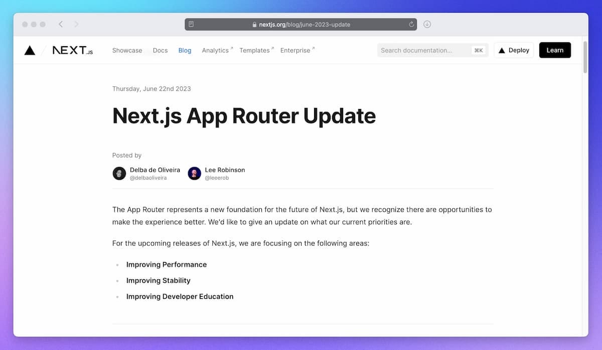 The Next.js team shares some context on the new App Router. They've received a lot of criticism lately and are well aware of the bugs and other problems with the current DX. They detail what they're working on in priority: