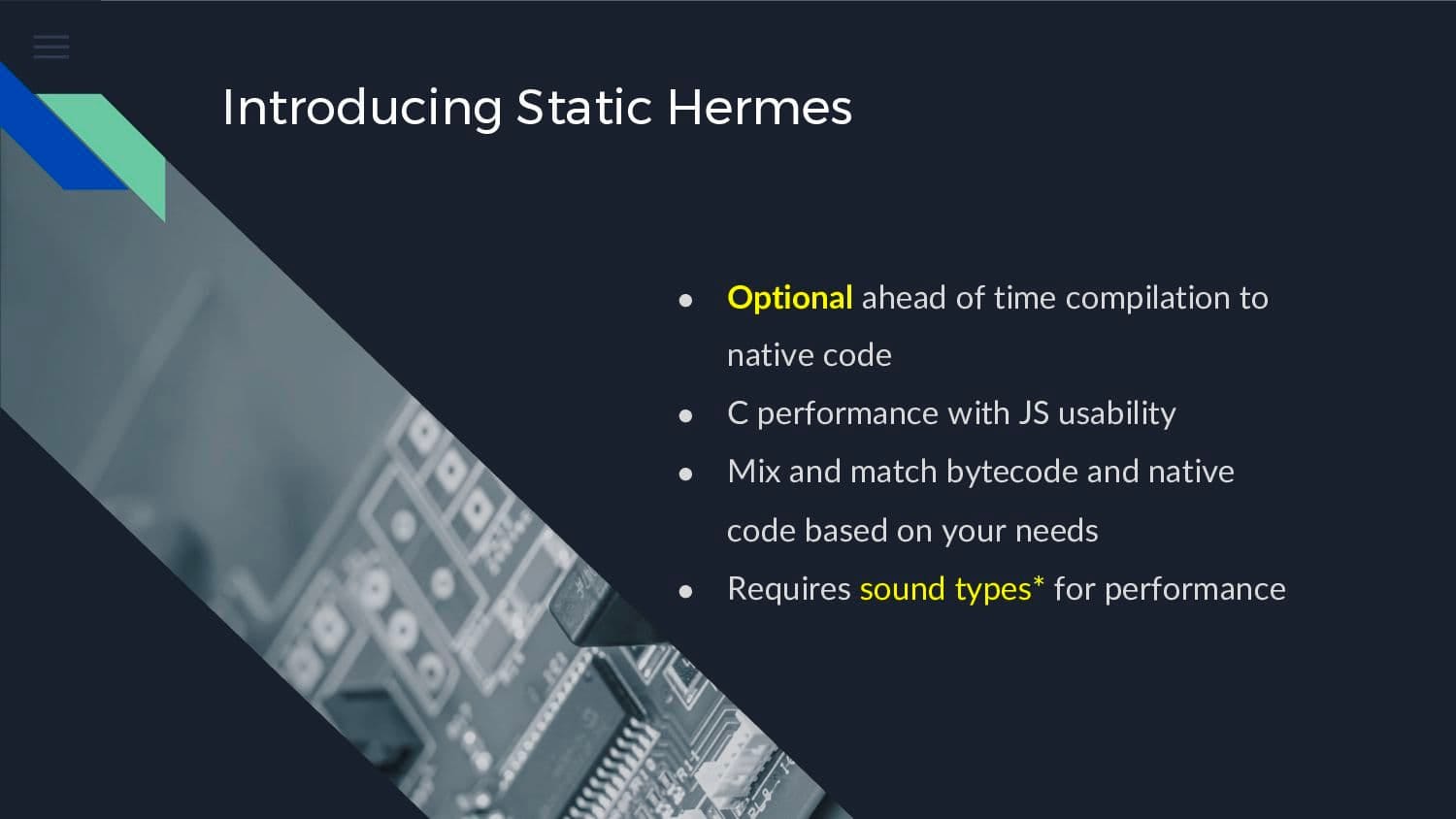 Static Hermes is an experimental project that allows you to optionally compile some of your TypeScript (or Flow) code into native code. This offers significant performance gains (x10-20) compared to Hermes usual mode based in bytecode interpretation. It also enables easy integration with native APIs directly from your TypeScript code (zero-cost FFI, x15-80 faster than a JSI wrapper).
