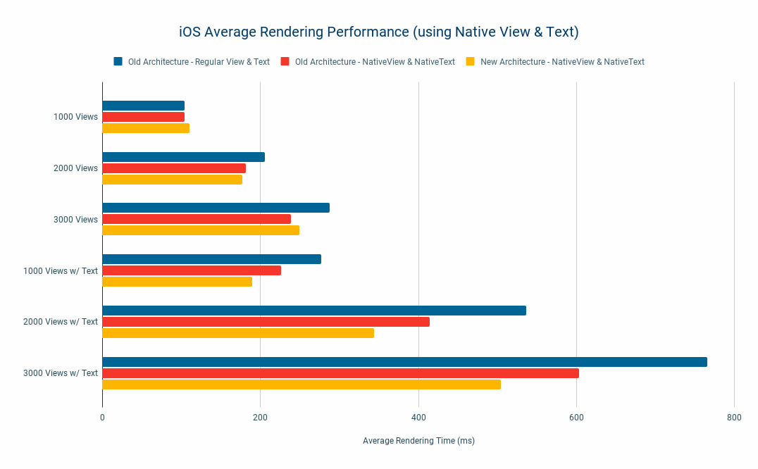 At the moment, React-Native devs are talking a lot on Twitter about the perf of the Text and View components, which are JS wrappers and add overhead compared to the respective native RCTText and RCTView elements. William Candillon had already 🎥 explained this problem in 2021, with the possibility of optimising Text rendering. It is possible to optimize as long as you don't need a few features like onPress listeners. This article presents a benchmark and measures the impact of using the native components instead of regular components, and reports a gain of around 15%, with variations depending on the platform and architecture.