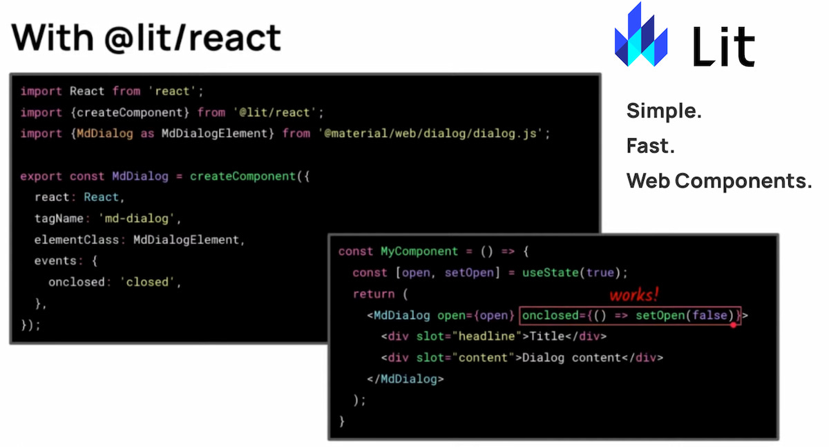 Google's Web Components framework Lit has just been released in v3.0. In addition to improvements to the framework (decorators, template compiler, Preact Signals), there is in particular the @lit/react integration package, which has graduated from the Lab, is now stable and in v1.0.