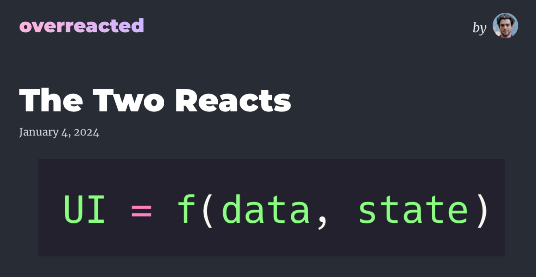 Great writeup from Dan Abramov, giving good reasons for code to run locally (instant feedback), as well as remotely (close to the data source). He proposes a new React formula: UI = f(data, state), where f represents all your whole React app, running in 2 distinct environments.