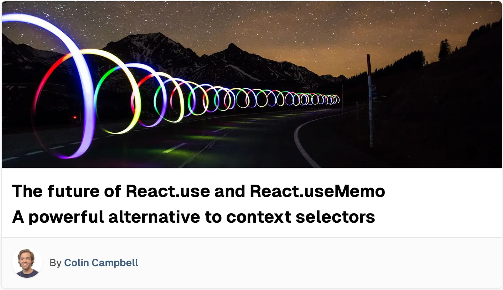The most interesting part is a great summary of the recent Twitter discussions. Dan Abramov explained context selectors do not compos well. Andrew Clark shared the plan to extend useMemo() and allow the usage of other hooks inside it. This would work with the use hook with any Usable types (currently context and promises, but maybe Observables and stores in the future?), but also third-party hooks! This would solve the fine-grained selection problem in a performant and composable way, and be compatible with the upcoming React Forget compiler.