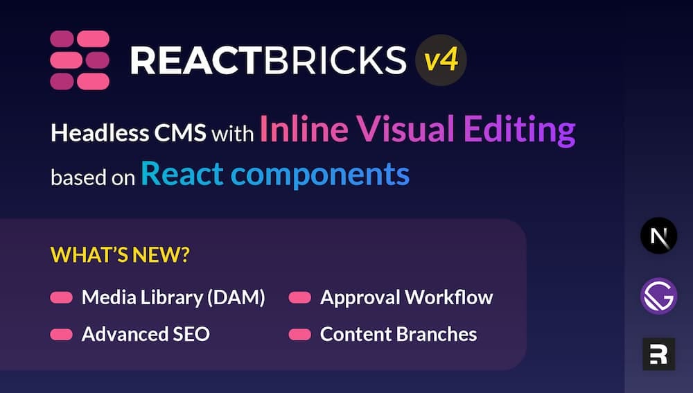 React Bricks is enterprise-ready with Digital Assets Management, Advanced SEO, Collaboration, Scheduled Publishing, Multilanguage, Integrations with external data sources, Approval Workflow, Single Sign-On, Multiple environments, Backup and Change history.
