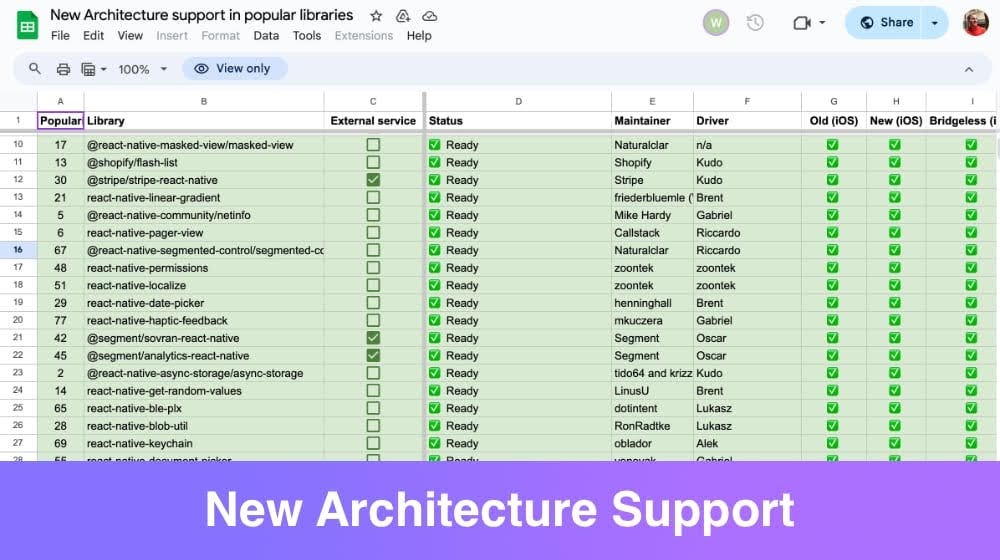 This week's headline news is … a spreadsheet? Yes, indeed. We’re approaching the release of React Native 0.74, which will have the Interop Layer and Bridgeless Mode enabled by default. And although you can still turn it off, the message is clear: It’s time to start adopting the New Architecture. There has been a lot of effort to prepare the RN ecosystem for the New Arch, and now there’s a great spreadsheet tracking New Architecture and Bridgeless Mode support for many popular RN libraries. As you can see in the screenshot above, there’s lots of green already, although plenty of rows require some more work as well. In my opinion, even beyond the pure question of which libraries already support the new paradigms this list is also very interesting if you only want to check out which RN libraries are the most popular ones or which technical challenges library authors face when shifting to the New Arch.