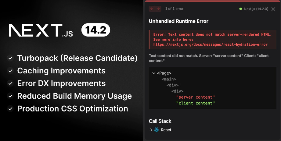 I’m excited to see a great React hydration mismatch error dialog already implemented in Next.js! As I write this, Turbopack is 99.9% ready for development usage (6 integration tests missing). For build usage, it’s 75% ready so we’ll have to wait a bit more.