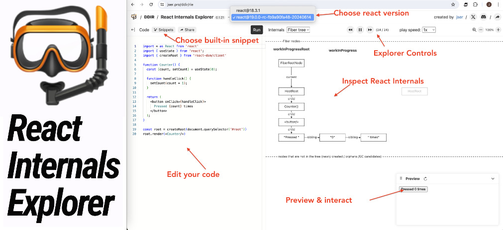A new interactive playground to see how React works under the hood. It’s possible to explore internals step-by-step. You can even select the React version, and it’s particularly relevant for today’s issue because it can show the Suspense behavior difference between React 18 and React 19!
