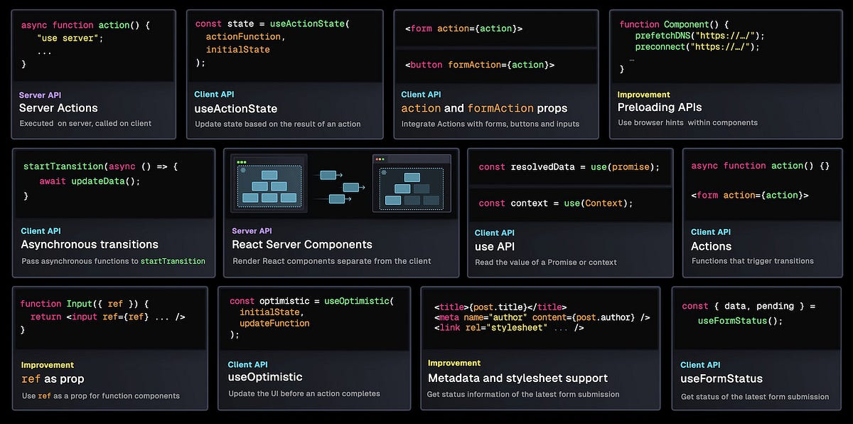 We haven’t had any huge React announcement this week, so I thought it would be cool to remind you about all the great upcoming React 19 features thanks to this great bento slide from Lydia Hallie’s talk. Note that React 19 is in Release Candidate and should be out soon.