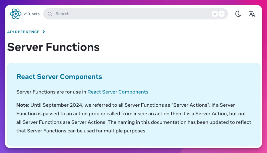 It’s not a code change, but it’s an impactful terminology change that is now officially published on the React v19 docs site. Server Actions are now considered a subset of a broader Server Function feature. It only becomes an action when used within: