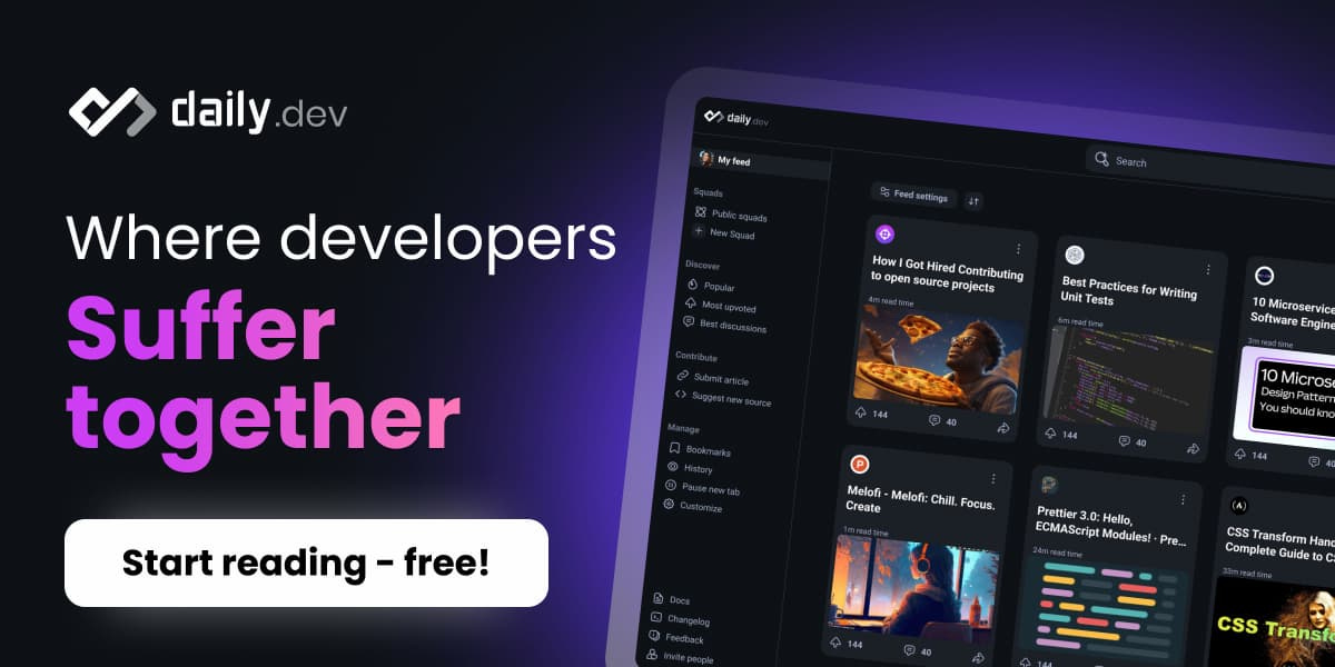 daily.dev brings over 1,000,000 developers a personal news feed with every update, framework and meme they need to know about. It’s totally free and you can opt out of listicles.