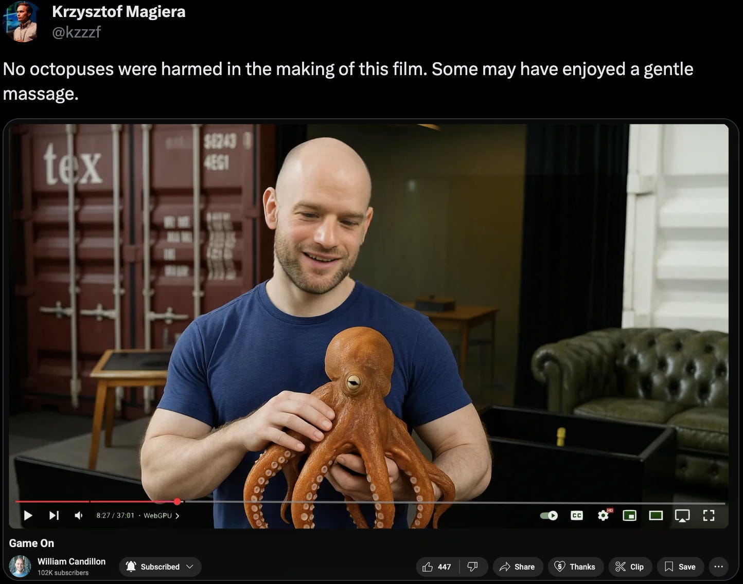 All this work was needed to create a new experimental Skia Graphite backend based on WebGPU. It enables composing and interleaving 2D/3D experiences in a performant way, like on the web, but across all platforms, with full Reanimated integration. Along the way, Skia doesn’t come with any new feature, but has significantly improved performance, reduced, crashes, and supports 3 new platforms: tvOS, macOS and Node. Keep massaging that octopus William!